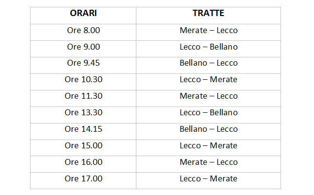 La navetta svolge il suo percorso, da lunedì a venerdì, partendo dal piazzale del Mandic per giungere al Manzoni e dall’Ospedale di Lecco per raggiungere l’Umberto I, e nelle direzioni opposte, con i seguenti orari: