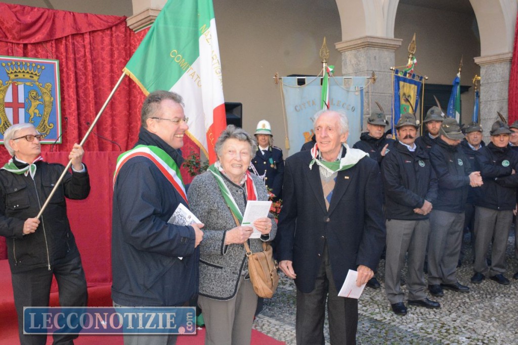 Infine l’omaggio del primo cittadino a Giancarla Pessina e Riccardo Benedetti, storici rappresentanti dell’associazione partigiani, ai quali il primo cittadino ha voluto donare la  nuova edizione a stampa di “Lecco e il suo territorio nella Lotta di Liberazione”, opuscolo  pubblicato in occasione della visita del presidente  Pertini.