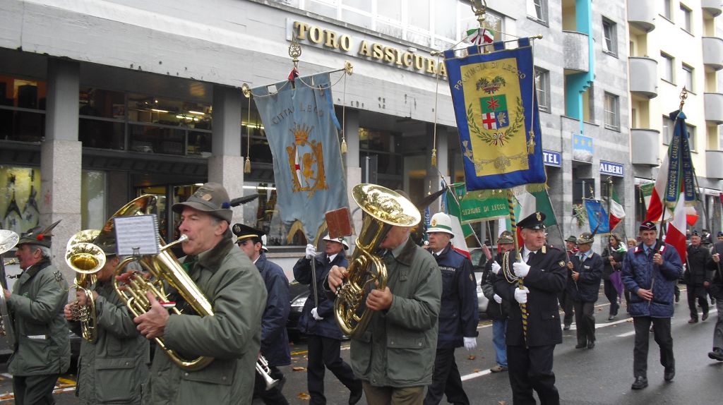 Alle 11.15, il Corteo si è mosso dalla chiesa fino al Monumento ai Caduti accompagnato dalla “Banda Associazione Nazionale Alpini di Lecco”, quindi si è svolta la celebrazione della Giornata delle Forze Armate e del Combattente, dell’Unità Nazionale, del Decorato al Valor Militare e dell’Orfano di Guerra, nel piazzale antistante il Monumento ai Caduti della città con l’Alza Bandiera e la Deposizione di corone di alloro ai Caduti e la lettura del Bollettino della Vittoria e dei messaggi augurali pervenuti.