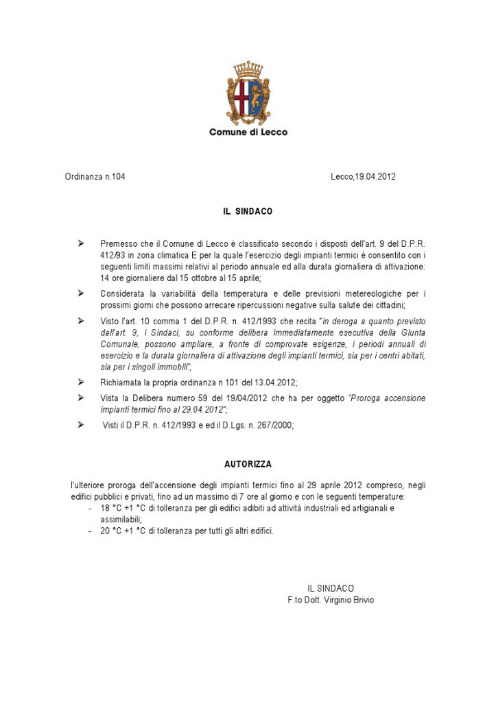 Infatti è appena giunta la comunicazione da parte del Comune di Lecco che recita: “Considerate le attuali condizioni climatiche ed i conseguenti abbassamenti di temperatura, al di sotto delle medie stagionali il Sindaco, come previsto dal D.P.R. 26.8.1993 n.412, autorizza la proroga dell’accensione degli impianti termici fino al 29 aprile 2012 compreso, negli edifici pubblici e privati, fino ad un massimo di 7 ore al giorno e con le seguenti temperature: 18 °C +1 °C di tolleranza per gli edifici adibiti ad attività industriali ed artigianali e assimilabili;- 20 °C +1 °C di tolleranza per tutti gli altri edifici”.