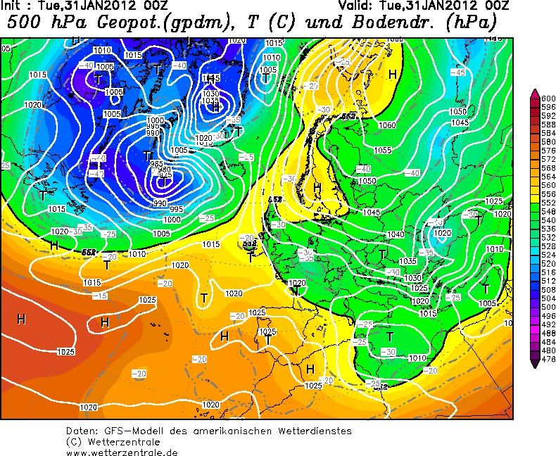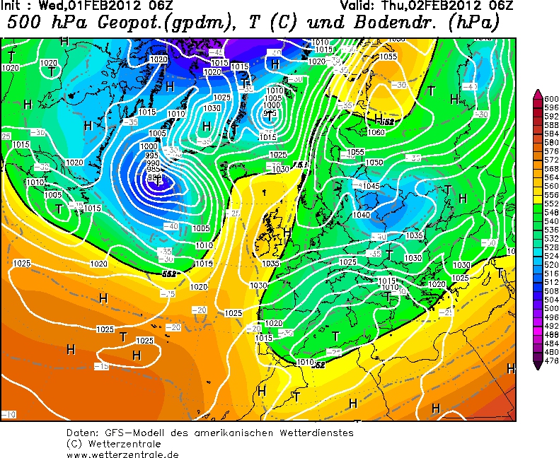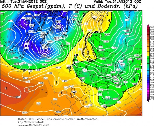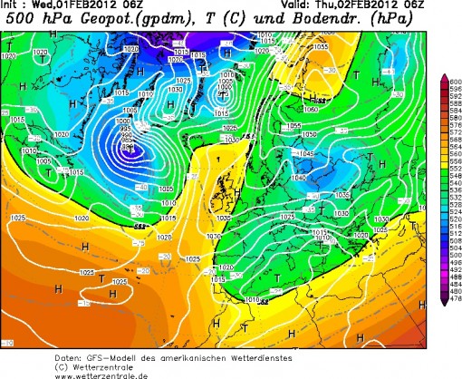 Come si nota in questa carta (fig. 2), sempre un elaborato del modello statunitense GFS da parte di Wetterzentrale, le correnti dovrebbero essere ancora Sud – Orientali, quindi con una situazione molto simile a quella dell’ultimo giorno del mese di gennaio. La temperatura dovrebbe essere più rigida, a causa della continua affluenza dell’aria fredda da Oriente.