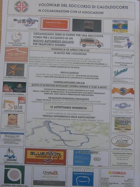 Il 22 aprile alle 8.30, invece, si svolgerà “in moto per i volontari”, un giro fra lago e montagne aperto a tutti gli appassionati di due ruote, con la possibilità poi di pranzare presso l’oratorio Maria Immacolata di Calolziocorte. “Si partirà dal BlueMoon – ha aggiunto Dario Valsecchi, titolare del bar e vicepresidente del motoclub BlueMoon on the road – ci saranno dei punti in cui si raggrupperanno i partecipanti ed un punto ristoro lungo il tragitto”. Qui la locandina.