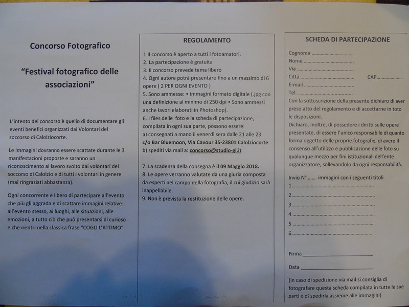 In contemporanea agli eventi vi sarà anche un concorso fotografico in collaborazione con il Fotoclub Libero Pensiero; “da sempre sosteniamo iniziative con un nobile fine – ha detto Gianni Lococciolo – abbiamo pensato di associare un “festival fotografico”, i partecipanti dovranno semplicemente catturare immagini delle iniziative, lo scatto migliore sarà poi premiato”. Un riconoscimento speciale andrà anche alla foto, pubblicata sulle pagine Facebook delle associazioni, che otterrà più like. Qui il regolamento pag 1, pag 2.