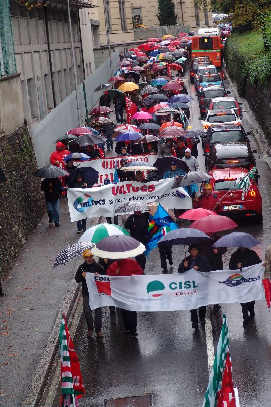 LECCO – Bandiera e ombrello: un corteo sotto la pioggia quello che si è svolto venerdì mattina a Lecco per lo sciopero generale indetto da Cgil, Cisl e Uil per protestare contro la legge di stabilità, al vaglio del Governo, ritenuta “insufficiente” dai sindacati.