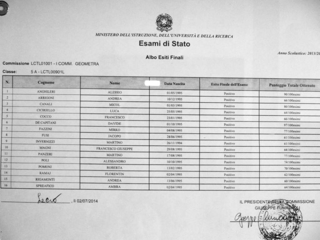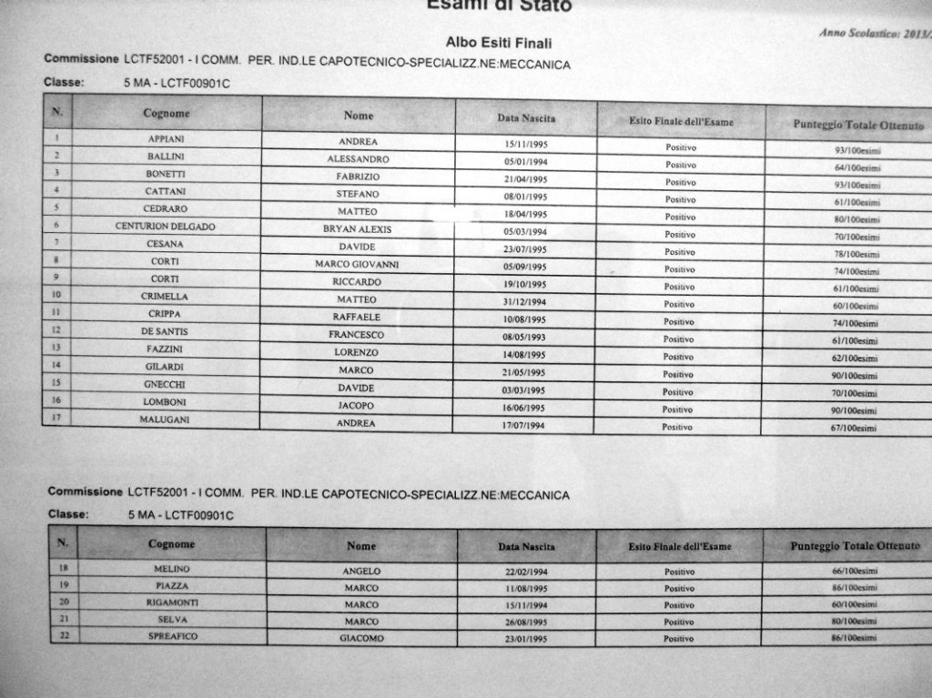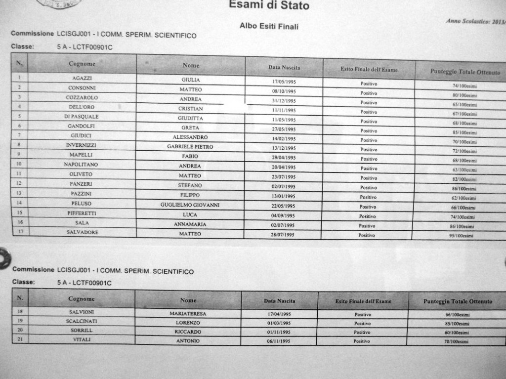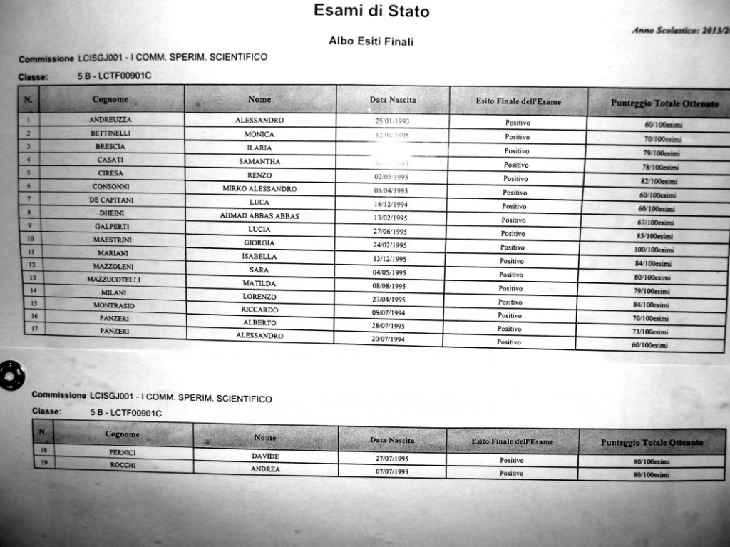Gli esiti registrano un solo bocciato e soltanto un 100/100, quello di Giorgia Maestrini della classe 5B sperimentale scientifico.