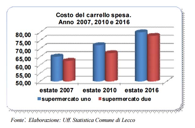 L’Ufficio Statistica del Comune di Lecco ha voluto realizzare un approfondimento sul costo di un ipotetico “carrello della spesa” composto da circa 30 prodotti alimentari.