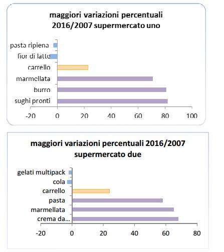 I maggiori rincari rispetto all’anno 2010 sono stati registrati da marmellata (70%), pane, pasta di semola e gelati multipack (i primi due prodotti in entrambi i supermercati) per oltre il 40%. Nel decennio (2007-2016) è ancora la marmellata a far registrare un aumento di prezzo (65-70%) ma anche burro e sughi pronti (circa 80%), crema da spalmare e pasta ( 68%- 58%).
