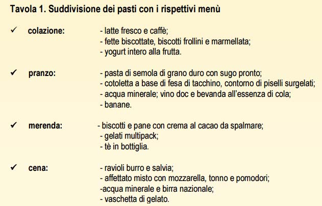 Per stabilire la composizione del carrello è stata considerata la sola spesa alimentare necessaria per “soddisfare” la colazione, il pranzo, la merenda e la cena di una famiglia di quattro persone (due adulti e due ragazzi), in una tipica e calda giornata estiva.