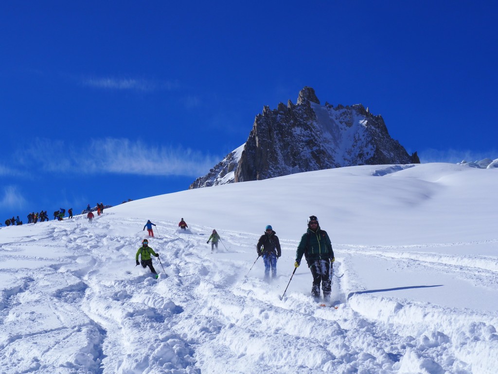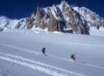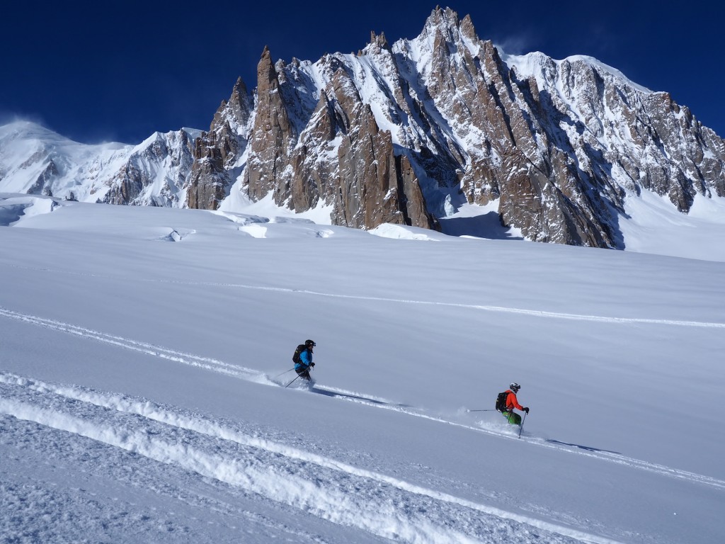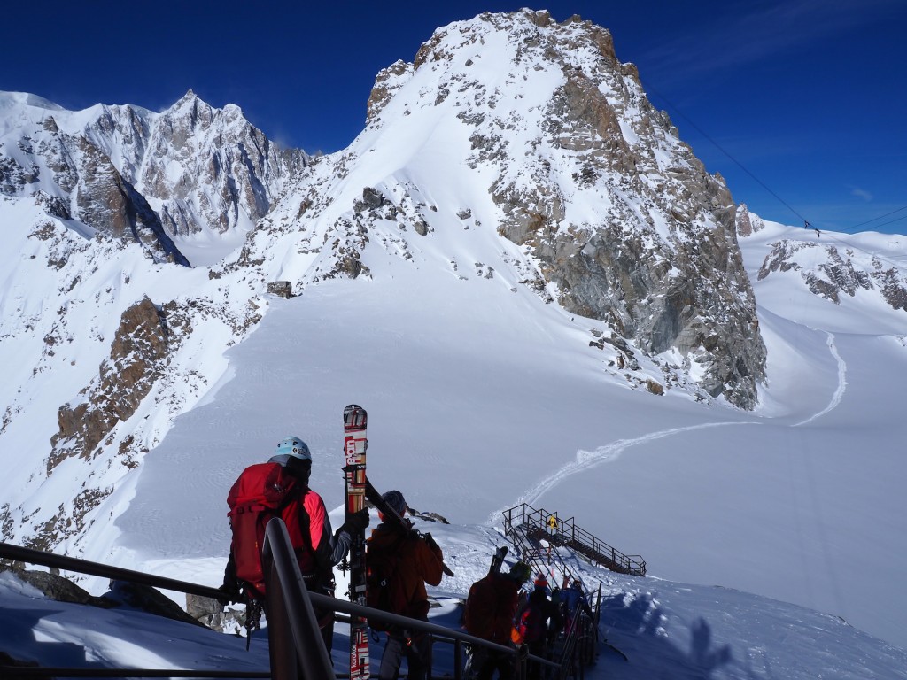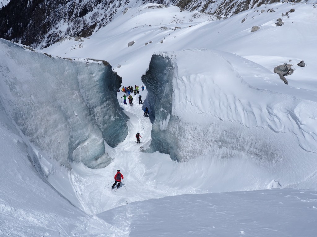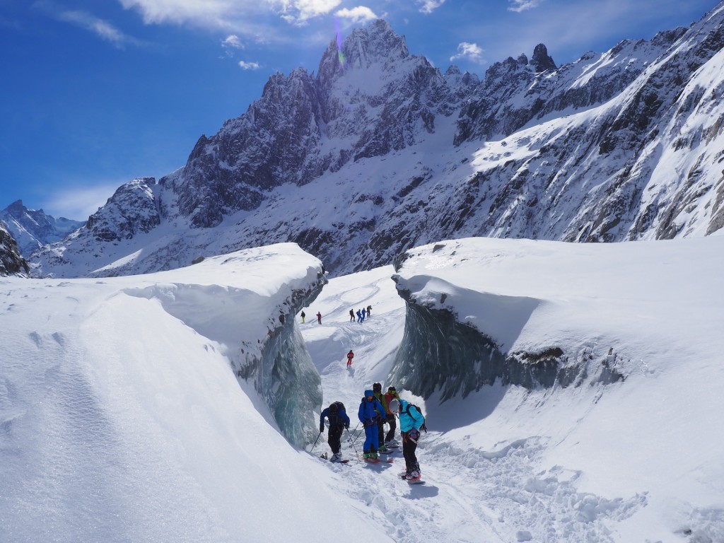 Il percorso di discesa della traversata parte da Punta Helbronner (3462 m) e arriva a Chamonix (1037 m): un tracciato di 24 km che si sviluppa nel cuore del massiccio del Monte Bianco lungo il ghiacciaio del Gigante, attraverso la Mer de Glace e, quindi, la Valle di Chamonix.