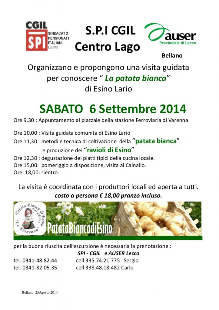 ESINO LARIO – Lo Spi Cgil Centro Lago organizza per sabato 6 settembre una visita guidata per conoscere la patata bianca di Esino Lario, programma e info nella locandina sotto riportata.