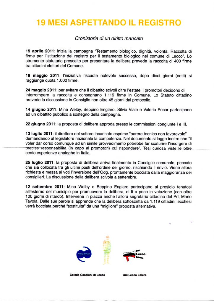Questa, in breve, la storia della proposta di delibera sull’istituzione di un registro per il testamento biologico nel comune di Lecco: dopo la raccolta di ben 1.119 firme da parte del comitato promotore, avvenute molto velocemente già entro la fine di maggio 2011, i risultati sono stati fatti pervenire in Comune e, secondo regolamento, la discussione in Consiglio comunale sarebbe dovuta avvenire entro i 45 giorni dalla data del protocollo. A giugno 2011 la proposta di delibera è approdata presso le commissioni I e III, mentre in Consiglio comunale la discussione è stata calendarizzata per la fine di luglio. Tuttavia, a partire da quella data e fino al successivo mese di novembre, l’iter della proposta ha subito soltanto numerose sospensioni, collocando il punto all’ordine del giorno sempre più in fondo tra le priorità della giunta.
