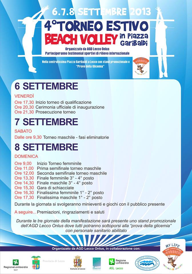 LECCO – Piazza Garibaldi torna anche quest’anno a trasformarsi in spiaggia per ospitare il 4° torneo estivo di beach volley organizzato da AGD Lecco, l’associazione lecchese per l’aiuto ai giovani diabetici, in collaborazione con Asl, Azienda Ospedaliera, Comune e Provincia di Lecco.