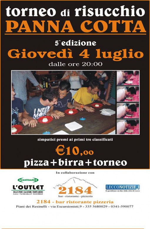 PIANI RESINELLI – Ci siamo. Il conto alla rovescia è cominciato. Tra due settimane, giovedì 4 luglio, al ristorante 2184 dei Piani Resinelli torna il grande appuntamento con il Torneo di Risucchio di Panna Cotta giunto alla sua 5^ edizione.
