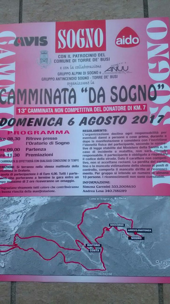 Per domenica 6 è prevista la “Camminata da Sogno“, una 7 km non competitiva, con partenza alle 8:30 dall’oratorio di Sogno, organizzata da Aido e Avis (Qui tutti i dettagli).