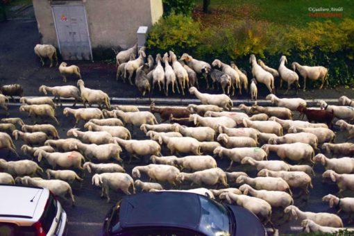 LECCO – Hanno fatto il giro del web ed sono finite addirittura su Repubblica.it le foto scattate dal lecchese Gualtiero Airoldi che ha immortalato la transumanza di un gregge di pecore per le strade di Lecco.