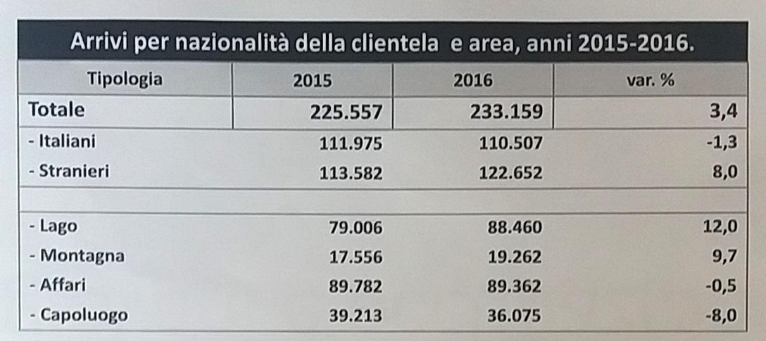 In tutta la provincia, gli arrivi sono cresciuti del 3,4% rispetto al 2015, da 225.557 a 233.159. Diminuiscono gli italiani (-1,3%), segno più invece per gli stranieri (+8%). Le notti trascorse nella nostra area nell’anno scorso sono state oltre 560.000 contro le circa 534.300 del 2015.