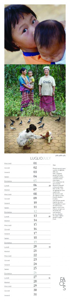 Tra le pagine del calendario i volti dei bimbi negli scatti frutto del lavoro dei tre fotografi coinvolti nel progetto (Beppe Raso, Fabio Zoratti e Susanna Melesi) accompagnate dai testi poetici curati da Alberto Bonacina e il tutto rielaborato nel lavoro del grafico Paolo Vallara.