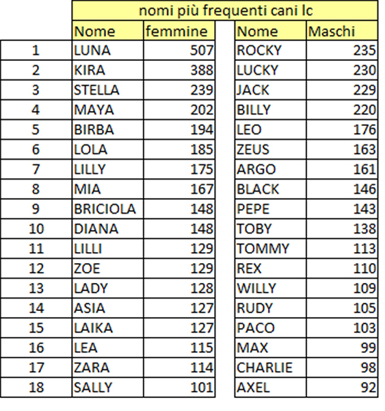 Sono tante le curiosità sul mondo dei ‘quattro zampe’ più amati che emergono spulciando l’anagrafe canina: per esempio che l’età media dei cani detenuti in provincia di Lecco è di sette anni e che è “Luna” il nome più utilizzato per le femmine, ben 507 esemplari sono stati chiamati così dai loro padroni.