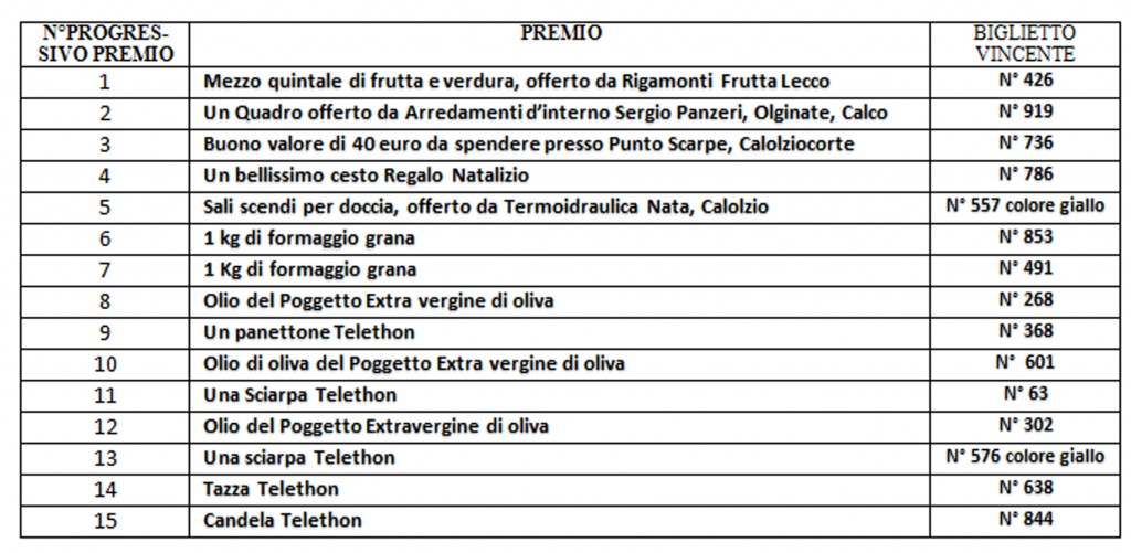 Martedì 22 dicembre 2015, presso la segreteria della Polisportiva di Monte Marenzo, sono stati estratti a sorte i seguenti numeri vincenti del concorso.