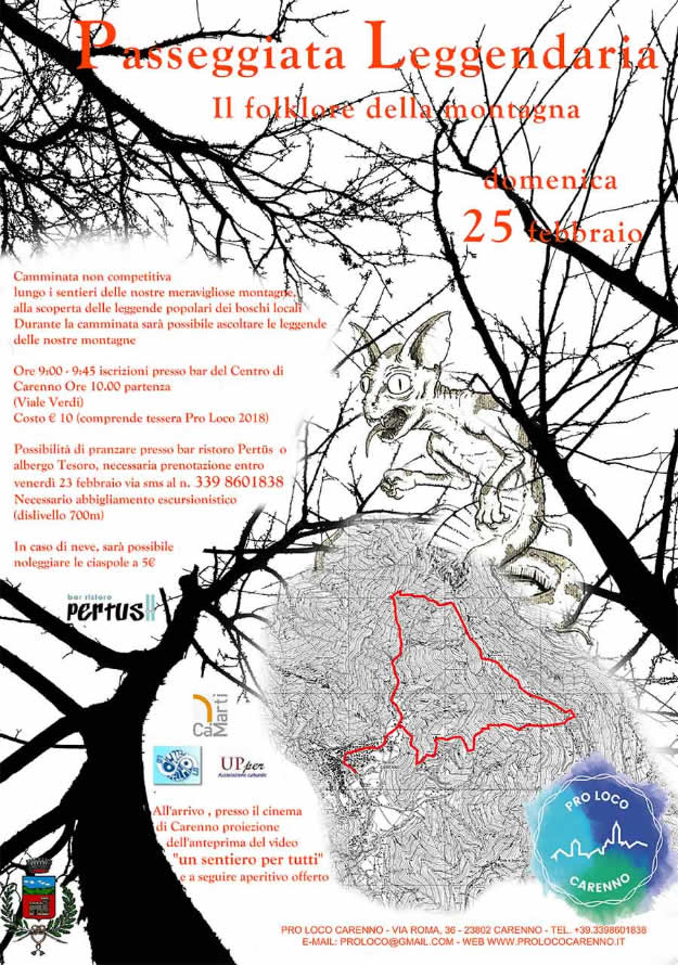 Nella mattina di domenica, invece, è in programma la “Passeggiata Leggendaria”, camminata non competitiva organizzata dalla Pro Loco. Sarà l’occasione per percorrere i sentieri intorno a Carenno alla scoperta delle leggende popolari, passo dopo passo sarà possibile ascoltare le leggende delle nostre montagne. Il ritrovo è fissato dalle ore 9 al bar del centro di Carenno, partenza ore 10 da via Verdi.