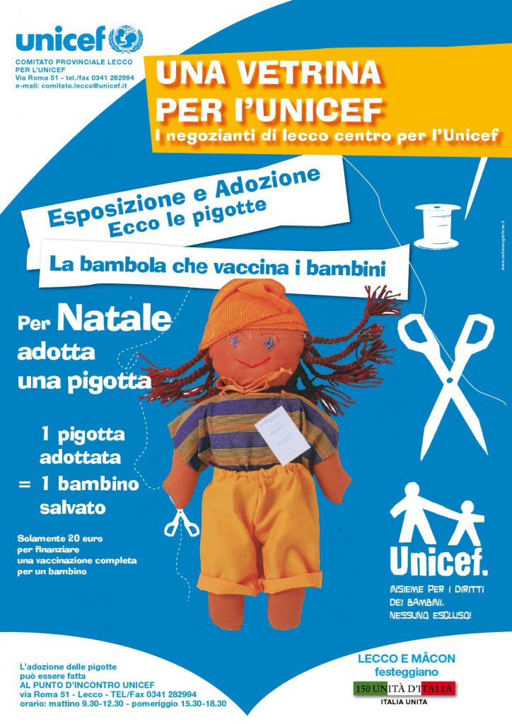 “Il ricavato dell’adozione delle Pigotte consentirà di fornire ai bambini dell’Africa Occidentale ( Benin ., Ciad, Ghana, Guinea Bissau ,Rep. Centrafricana, Senegal , Togo,Rep.Dem. Del Congo ) il Kit salvavita dell’UNICEF composto da: vaccini, dosi di vitamina A , antibiotici ed una zanzariera – spiega  il professore Salvatore Tarallo presidente del Comitato Provinciale Unicef che prosegue – A dicembre i cittadini e gli amici dell’UNICEF potranno adottare la Pigotta (pari al costo di un kit salvavita) recandosi direttamente al punto d’incontro UNICEF di Via Roma, 51 Lecco da mercoledì a sabato nei seguenti orari 9.30- 12.30 / 15,30 -19.00 domenica dalle 15 / 19 o inviando un fax al numero 0341 282994 o una e-mail all’indirizzo comitato.lecco@unicef.it”