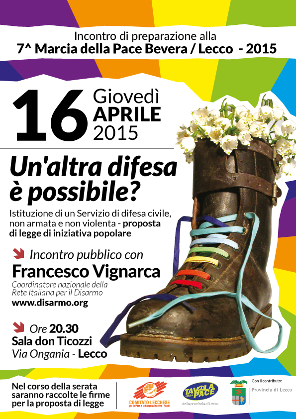 Marcia-della-Pace-2015---Evento-16-Aprile - VolantinoLECCO   – Giovedì 16 aprile ore 20.30 alla sala Don Ticozzi, incontro pubblico sulla proposta di istituzione di un servizo di difesa civile non armata e non violenta.