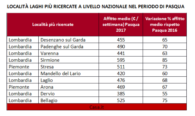Il Garda batte Como, le località più gettonate sono infatti Desenzano del Garda (455€ di affitto medio per una casa vacanze la settimana di Pasqua), Sirmione (595€) e Padenghe sul Garda (490€), che, rispetto a Pasqua 2016. Ma tra le mete preferite resta il lago di Como, che vede le sue due sponde sfidarsi sui prezzi per una settimana di relax: quella comasca con Bellagio, dove una casa vacanza costa in media 525€, e Laglio (476€), mentre quella lecchese con Varenna (441€), Mandello del Lario (420€) e Dervio (385€). Sul lago maggiore Stresa e Arona conquistano un buon numero di italiani: trascorrere qui il weekend di Pasqua costa rispettivamente 511€ e 469€.