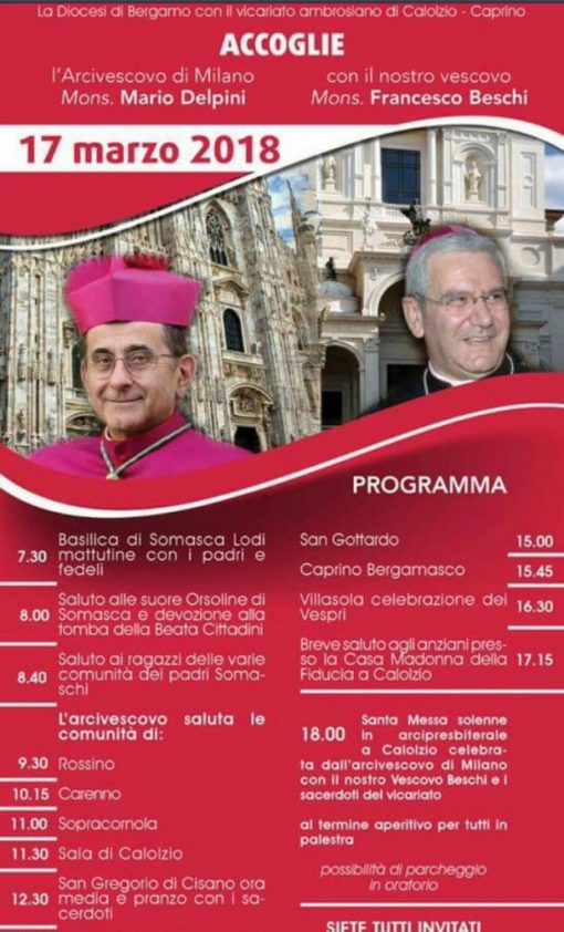 CALOLZIOCORTE – La visita in Valle san Martino dell’Arcivescovo di Milano Mons. Mario Delpini e del Vescovo Mons. Francesco Beschi è in programma per sabato prossimo, 17 marzo.