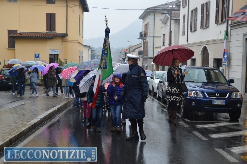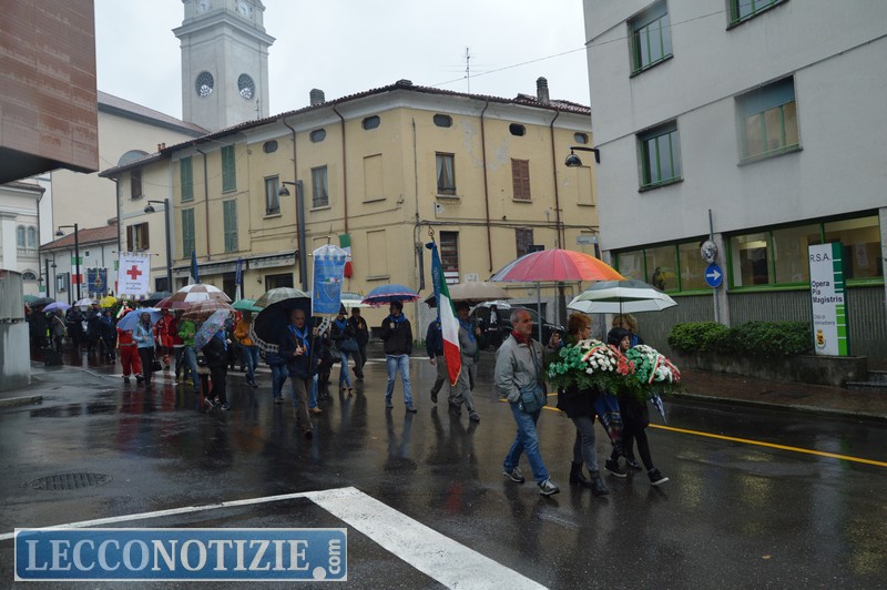 Alle 9.15 il tradizionale corteo incurante della pioggia è sfilato dal comune di Valmadrera sino al monumento dei caduti, dove sono state deposte due corone di fiori, dopo un breve momento di raccoglimento il corteo è ripartito con destinazione aula consigliare del municipio di Valmadrera e non al Santuario del San Martino come da programma, modificato a causa del maltempo.