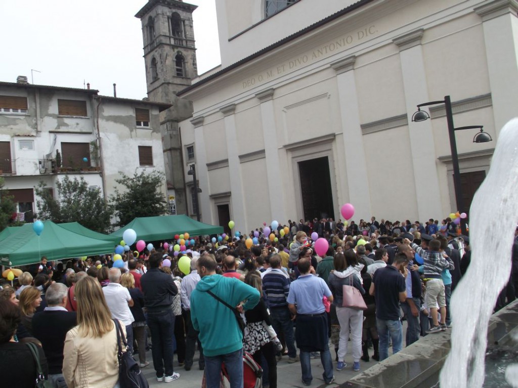 Alla fine della Santa Messa, don Massimo è stato accolto all’uscita della chiesa da un imponente scroscio di applausi, dal suono delle trombe da stadio e da uno scenografico lancio di palloncini.