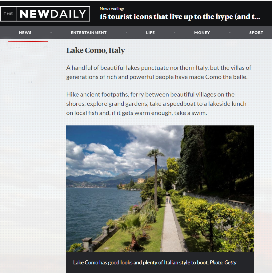 Il giornale australiano ha scelto per rappresentare il Lario una foto che raffigura uno scorcio dei giardini di Villa Monastero di Varenna come simbolo della bellezza dell’intero territorio del nostro lago, individuando, come cifra caratteristica che ha reso il nostro specchio d’acqua prealpino il più bello tra quelli del nord Italia, in Varenna la bellezza più rappresentativa.