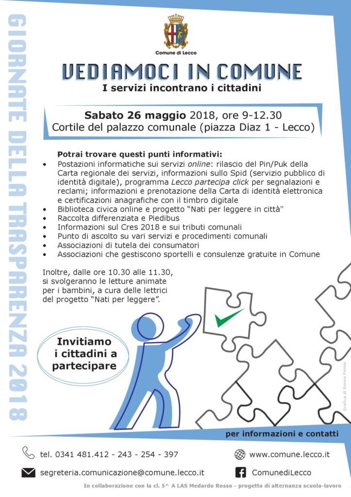 Questo sabato nel cortile del palazzo comunale, in piazza Diaz 1 a Lecco, nell’ambito delle Giornate della trasparenza 2018, con l’iniziativa “Vediamoci in Comune. I servizi incontrano i cittadini”, saranno allestiti stand informativi attraverso i quali saranno presentati e illustrati i progetti e i servizi alla cittadinanza offerti dai principali uffici comunali, nonché dalle associazioni di tutela dei consumatori e di quelle che offrono consulenze gratuite in Comune.