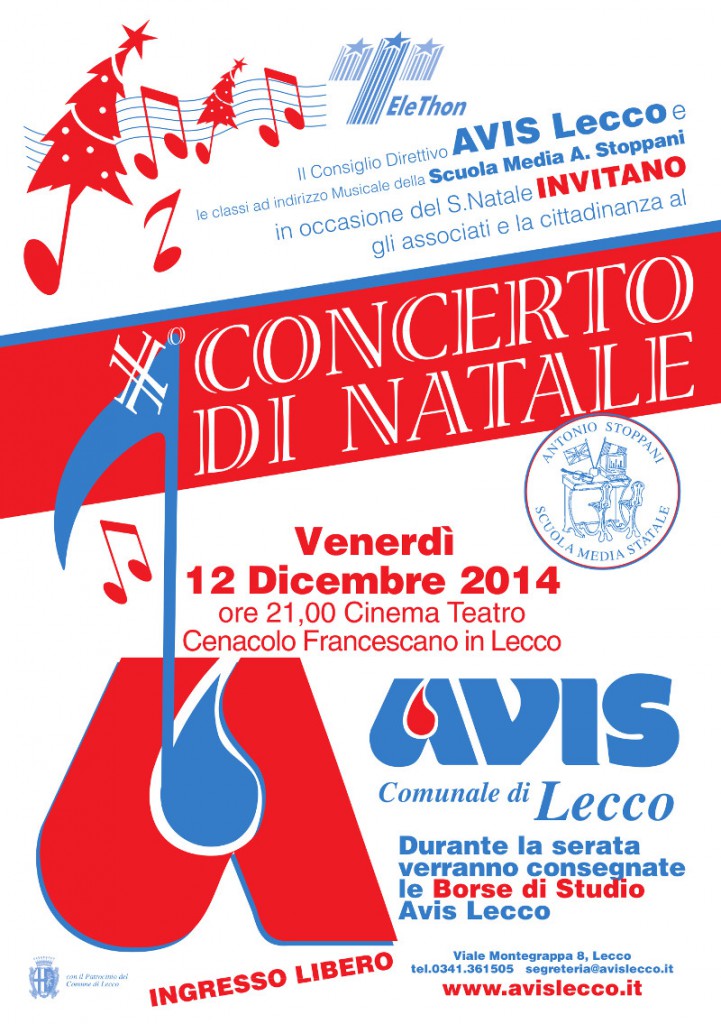 LECCO – Venerdì 12 dicembre si terrà, presso il Teatro Cenacolo Francescano di Lecco, il Concerto di Natale 2014 organizzato dall’Avis Comunale di Lecco con le classi musicali della Scuola Media A. Stoppani. Durante la serata verranno consegnate le borse di studio che l’Avis di Lecco ha assegnato agli studenti meritevoli e sarà presente una delegazione di Telethon per spiegare l’importanza della ricerca contro le malattie genetiche e fare il punto della situazione rispetto alle ultime scoperte.