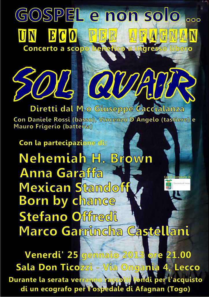 LECCO – Si terrà venerdì 25 gennaio un concerto benefico che vedrà sul palco i Sol Quair diretti dal maestro Caccialanza accompagnati da altri ospiti. Il concerto benefico, ad ingresso libero, avrà lo scopo di raccogliere proventi a favore di un ospedale rurale del Togo.