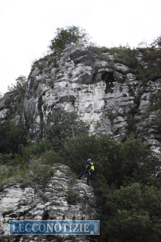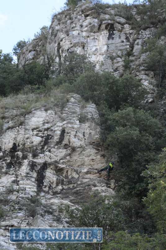 Accompagnati dai Vigili del Fuoco con una jeep all’imbocco del sentiero che conduce alla Rocca di Vercurago, hanno raggiunto l’altura; un’operatore si è calato con le corde sul versante che guarda la strada ed ha iniziato il disaggio del materiale pericolante.