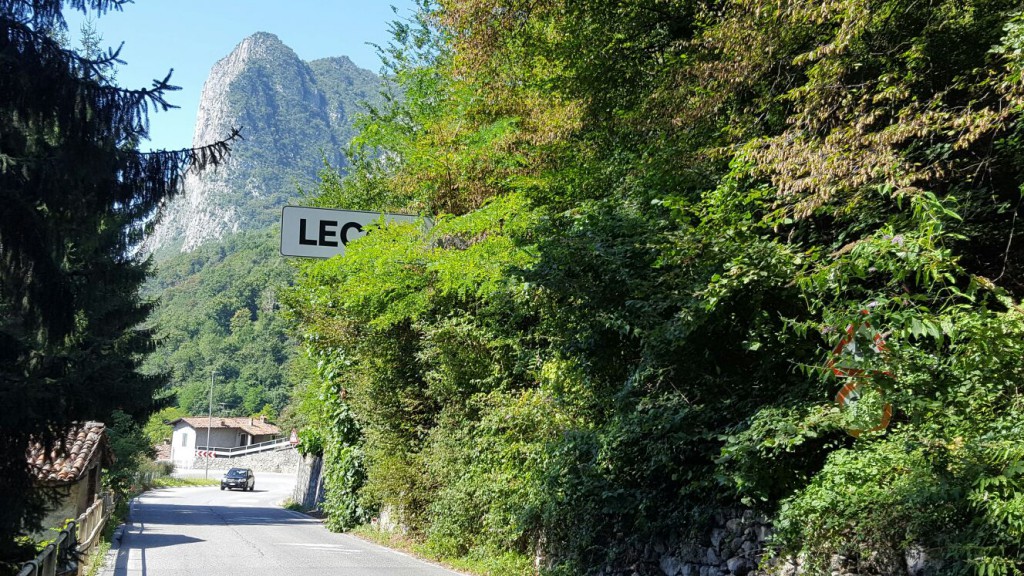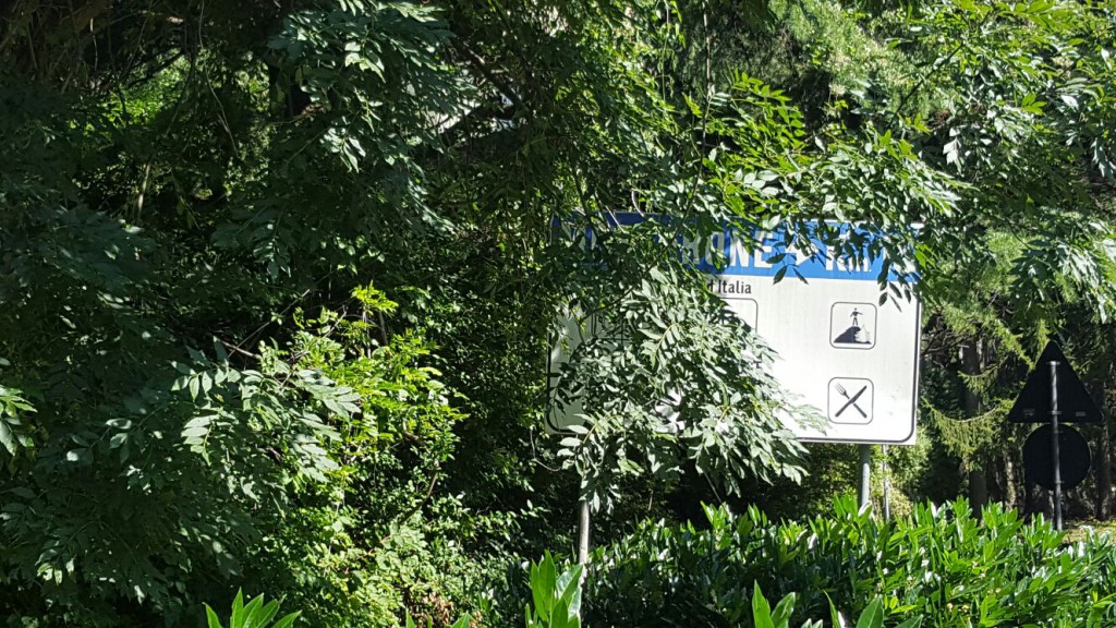 Il cartello recante il nome della città coperto dalla vegetazione sulla Lecco – Ballabio