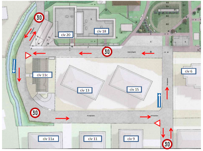 Viene, in particolare, istituito il senso unico di marcia nel tratto e nel senso compreso tra il civico 6 e il civico 20 e tra il civico 11c e il civico 15, come illustrato nel disegno planimetrico allegato e il divieto di sosta permanente con rimozione forzata dei veicoli lungo il tratto rettilineo antistante l’area di parcheggio, i civici 18-20 e i civici 13-15.