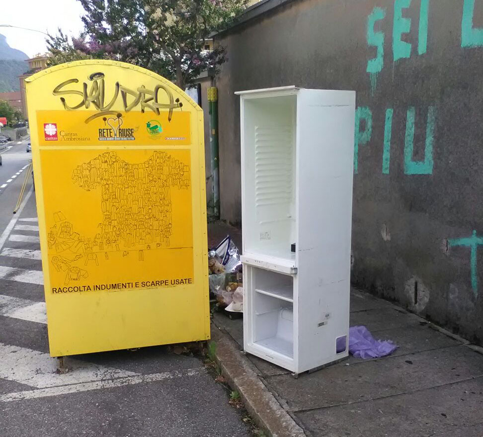 LECCO – “L’inciviltà è sempre dietro l’angolo” ci scrive un lettore inviandoci questa foto scattata in via Tonale: un frigorifero abbandonato accanto al cassone per il deposito di vestiti usati da destinare ai bisognosi.