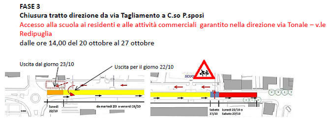 La terza e ultima fase dei lavori è prevista a seguire e comporterà dalle 14 di sabato 20 ottobre alle 12 di sabato 27 ottobre l’istituzione del divieto di transito nel tratto compreso tra corso Promessi Sposi e via Tagliamento, limitatamente alla direttrice Tagliamento/Tonale. Sarà garantito l’accesso alla scuola, ai residenti e alle attività commerciali da viale Redipuglia a via Tonale.