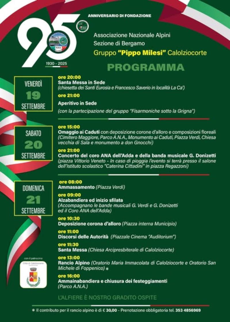 CALOLZIOCORTE – Saranno tre giorni intensi quelli del 19, 20 e 21 settembre per il gruppo alpini “Pippo Milesi” di Calolziocorte che si prepara a festeggiare l’importantissimo traguardo del 95° anniversario di fondazione. Una lunga storia sempre fondata sui valori alpini a partire dalla solidarietà e da una costante presenza all’interno della comunità.