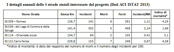 La scelta di intervenire sulle strade statali italiane si lega al fatto che, nell’ultimo anno, queste tratte hanno fatto registrare oltre 31 morti a settimana, per un totale di 1643 decessi, pari al 48,5% del totale dei morti per incidente stradale in Italia. In questo quadro, sono state scelte 4 tra le arterie più pericolose d’Italia per numero di incidenti e morti.
