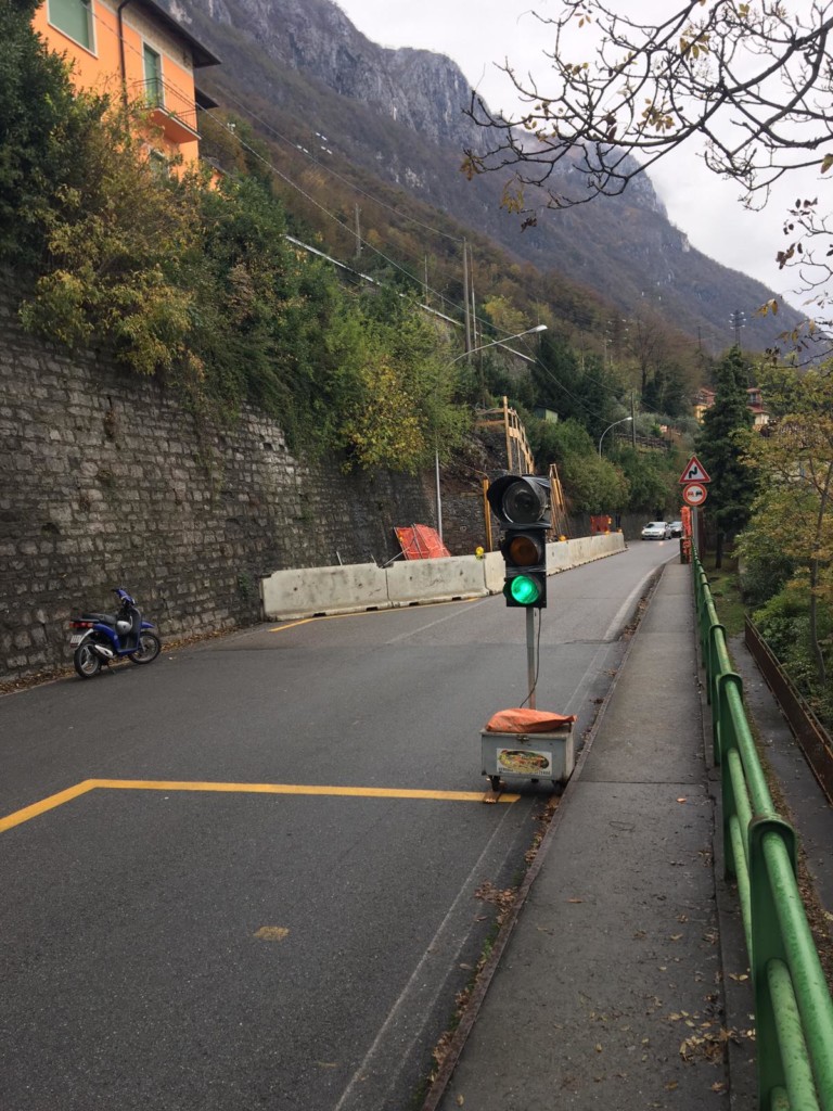 A mezzanotte, la Perla del Lario è tornata raggiungibile da Fiumelatte con i movieri e poi con un semaforo garantire il senso alternato nel tratto di carreggiata interessato dal crollo (foto S. Sandonini)