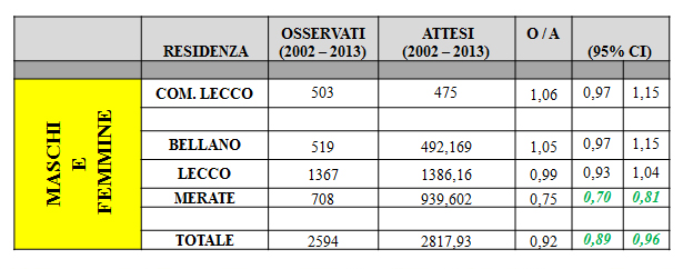 Complessivamente si parla di 2594 casi di cancro polmonare osservati nella popolazione della provincia di Lecco tra il 2002 e il 2013, un valore più basso rispetto 2817 casi attesi in base ai fattori di rischio.