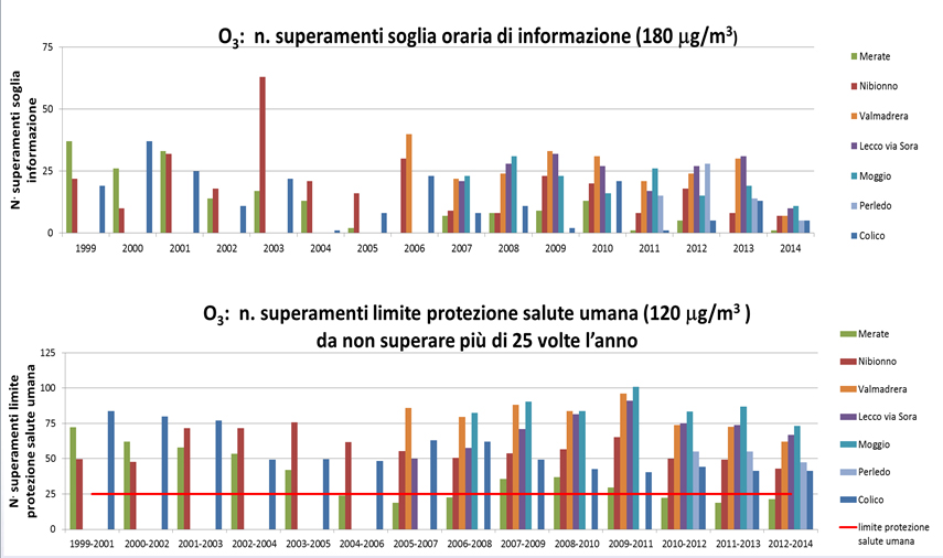 Un approfondimento che ha messo in luce come anche l’ozono, a pari del Pm10, rappresenti una delle principali fonti di inquinamento dell’aria che respirano i lecchesi. Anche in questo caso si parla di superamenti giornalieri della soglia prevista a tutela della salute pubblica: praticamente in tutta la provincia (ad eccezione in questo caso dell’area di Merate dove i valori risulterebbero più bassi), negli ultimi 15 anni si è andati ben oltre le 25 giornate di sforamento consentite. I dati peggiori sono rilevati dalla stazione di Moggio che tra il 2009 e il 2011 ha superato il limite mediamente 100 giorni all’anno.
