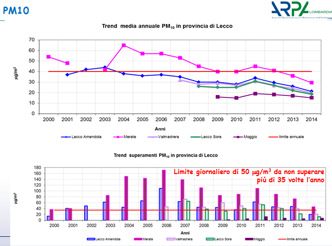 Un problema che tocca in modo particolare la zona del meratese che, nel recente passato, ha conosciuto il picco del fenomeno tra il 2004 e il 2006 arrivando a sfiorare una media annuale di 70 µg/m3 e un picco di 180 sforamenti giornalieri, per poi iniziare negli ultimi anni una progressiva discesa con i dati del 2014 che hanno rilevato una media annuale intorno ai 30 µg/m3.