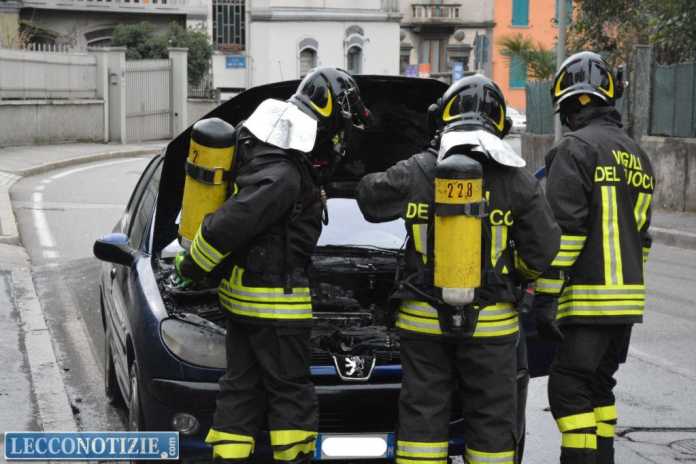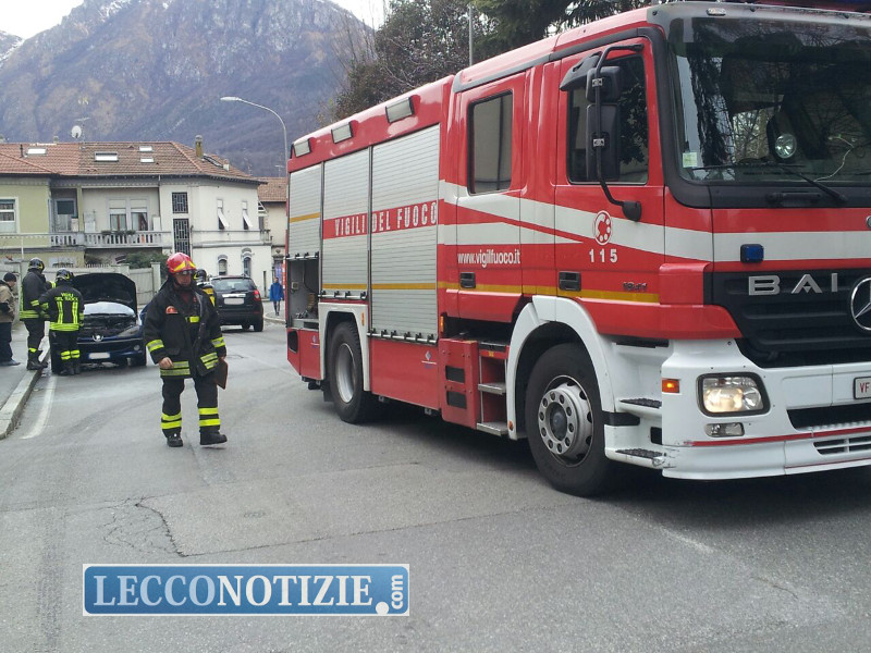 LECCO – Spavento per una donna al volante della sua Peugeot che ha visto il vano motore prendere fuoco. L’incidente è avvenuto alle 13 circa di oggi, lunedì, quando la donna stava procedendo lungo Corso Promessi Sposi in direzione di Acquate e, giunta all’altezza della Questura, ha visto fuori uscire dal cofano del fumo; a quel punto ha fermato l’auto a bordo strada, l’ha spenta e ha tentato di riaccenderla ma la situazione non è migliorata, il fumo è continuato ad uscire fino a che sono apparse le fiamme.