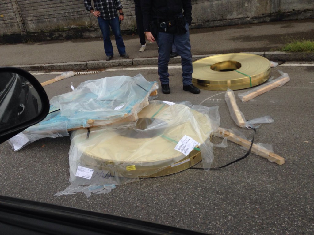 LECCO – Ha perso il parte del carico, ovvero grossi nastri di ottone, l’autotreno che intorno all’ora di pranzo di martedì si spostava a Belledo, in prossimità della rotatoria per viale Valsugana.