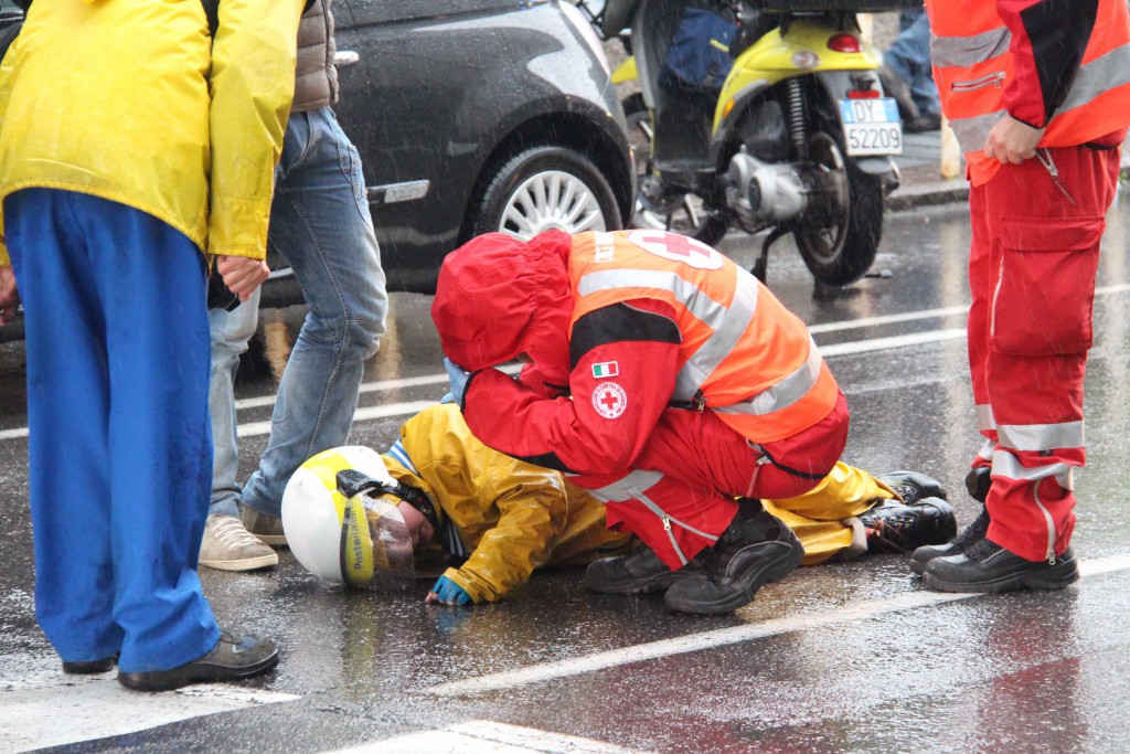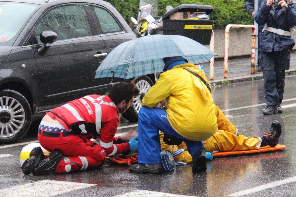 La postina è finita rovinosamente al suolo ed è stata inizialmente soccorsa dai passanti fino all’arrivo della Polizia Locale e degli uomini della Croce Rossa che si sono presi cura della 46enne, trasferendola in ospedale per traumi a tibia e perone.