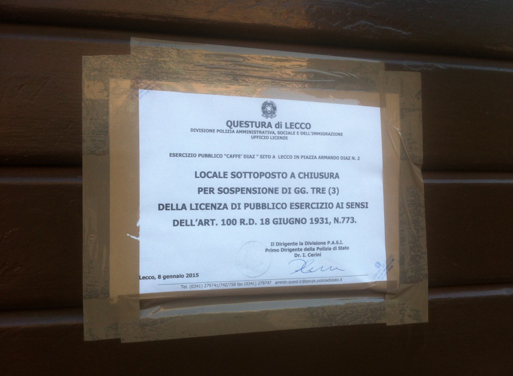 LECCO – I frequentatori del Caffè Diaz giovedì mattina hanno trovato la serranda del locale abbassata: il bar, situato nei pressi dell’omonima piazza di fronte al Comune, è stato infatti chiuso dopo la temporanea sospensione della licenza di pubblico esercizio ai titolari.