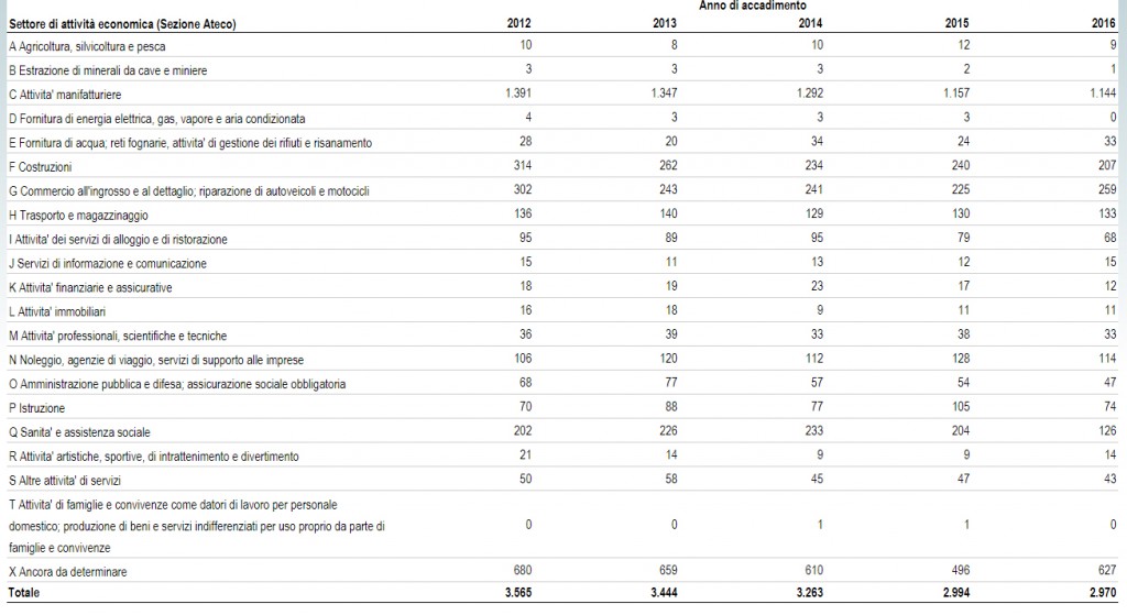 E’ in quest’ultimo ambito lavorativo che si concentrano però gli infortuni anche in provincia di Lecco, tendenza confermata dai dati del 2016 con 1144 incidenti in fabbrica, un numero in diminuzione rispetto ai dati degli anni precedenti fino al 2012 quando si contavano 1391 episodi sono nel settore della manifattura.